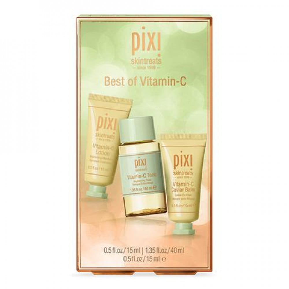 مجموعة بيكسي العالمية المكونة من ثلاث قطع للعناية بالبشرة المدعمة بفيتامين سي أو ج، تحتوي هذه المجموعة على لوشن فيتامين سي بحجم 15 مل يعمل على تفتيح البشرة و نضارتها، تونيك فيتامين سي بحجم 40 مل يجعل بشرتك حريرية و بلون متوحد، بلسم الكافيار بفيتامين سي بحجم 15 مل و الذي يعمل على ترطيب البشرة القوي و العميق