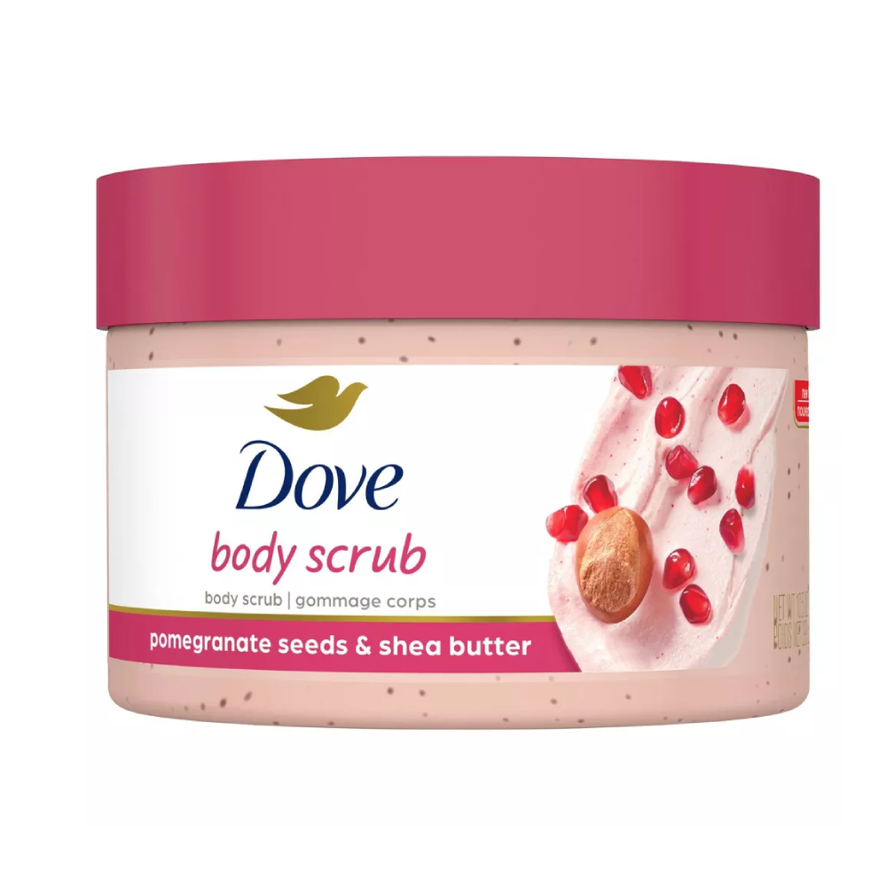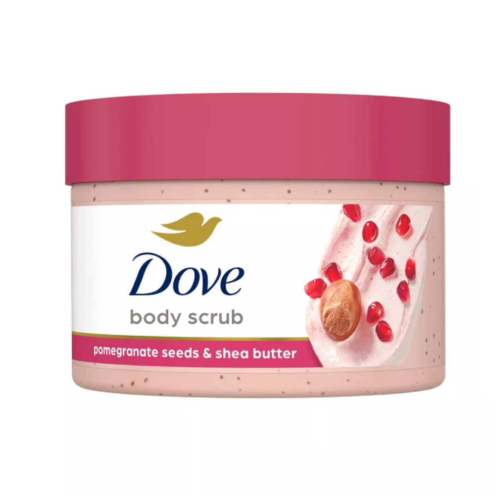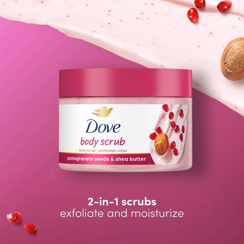 تقشير معتدل - مصنوع من جزيئات تقشير بحجم رمال الشاطئ، مقشر الجسم دوف بخلاصة الرمان وزبدة الشيا ناعم ويسهل فرده مع رغوة خفيفة.