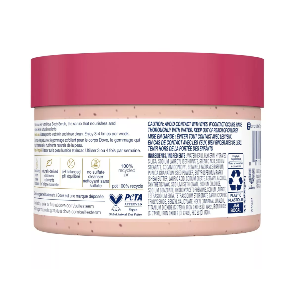 هناك خطوة أساسية واحدة لتحقيق بشرة ناعمة لا ينبغي إغفالها: التقشير. لذا، تخلصي من البشرة الجافة والباهتة بلطف مع العناية ببشرتك باستخدام مقشر الجسم المقشر ببذور الرمان وزبدة الشيا من دوف. مصنوع من ربع كريم مرطب، يعمل مقشر الجسم المقشر هذا على استعادة العناصر الغذائية للبشرة أثناء التقشير، مما يجعل بشرتك ناعمة كالحرير. بفضل ملمسه الناعم الذي يمكن فرده بسهولة، يمنحك مقشر الجسم من دوف تغطية كريمية رائعة مع إطلاق رائحة الرمان الحلوة. احصلي على كل الفعالية التي تبحثين عنها في المقشرات أو مقشر الاستحمام، ولكن مع التغذية والعناية التي تحتاجها بشرتك أثناء الاستحمام. للاستخدام، اغرفي كمية وفيرة من مقشر الجسم المقشر ببذور الرمان وزبدة الشيا من دوف من البرطمان. دلكي جسمك بالكامل بحركات دائرية للحصول على تغطية كريمية، ثم اشطفيه للكشف عن بشرة ناعمة كالحرير. استخدميه 3-4 مرات أسبوعيًا كجزء من نظام العناية بالبشرة، ثم استخدمي غسول الجسم من دوف أو بار التجميل للحصول على بشرة ناعمة الملمس. جربي مقشر الجسم من دوف للحصول على بشرة جاهزة للشاطئ، أو تحضير البشرة للتسمير، أو للمساعدة في التقشير قبل الحلاقة للمساعدة في منع نمو الشعر تحت الجلد. ستحبين الشعور ببشرة ناعمة كالحرير في جميع أنحاء الجسم. بالإضافة إلى ذلك، عندما تشترين دوف، يمكنك التأكد من أنك تعتني ببشرتك بمنتجات حاصلة على شهادة PETA Cruelty-Free. وعلى مستوى الشركة، نحن أيضًا في مهمة لمساعدة الجيل القادم من النساء على تطوير علاقة إيجابية مع مظهرهن - الوصول إلى أكثر من ربع مليار شاب من خلال تعليم احترام الذات بحلول عام 2030. نحن ملتزمون أيضًا بالحد بشكل كبير من النفايات البلاستيكية بحلول عام 2025. ويشمل ذلك تقليل استخدامنا للبلاستيك الخام بمقدار 20500 طن متري سنويًا، وإطلاق زجاجات بلاستيكية جديدة معاد تدويرها بنسبة 100% وتجربة تنسيقات جديدة قابلة لإعادة التعبئة لمنتجات معينة مختارة.