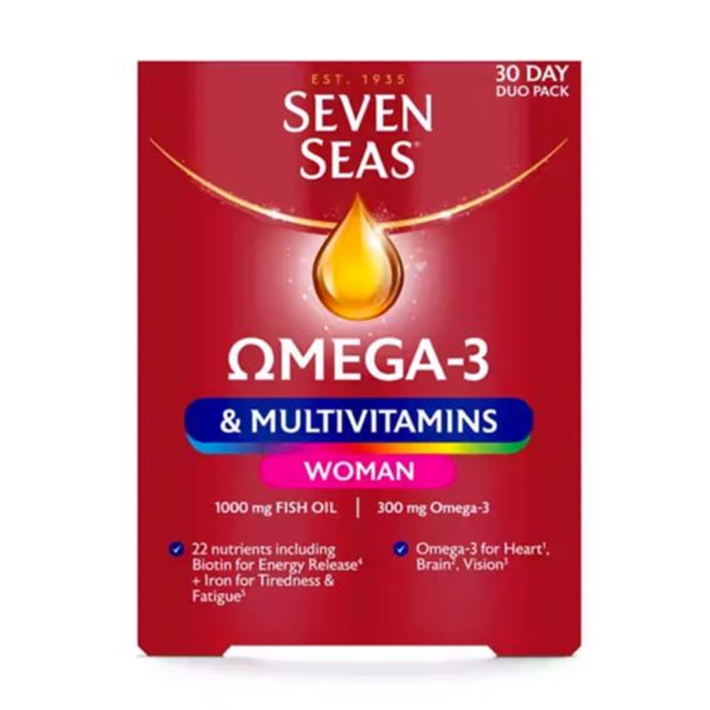 مكمل غذائي خاص بالنساء من ماركة سيفن سيز (Seven Seas). يحتوي على مزيج من أوميجا 3 وفيتامينات متعددة.