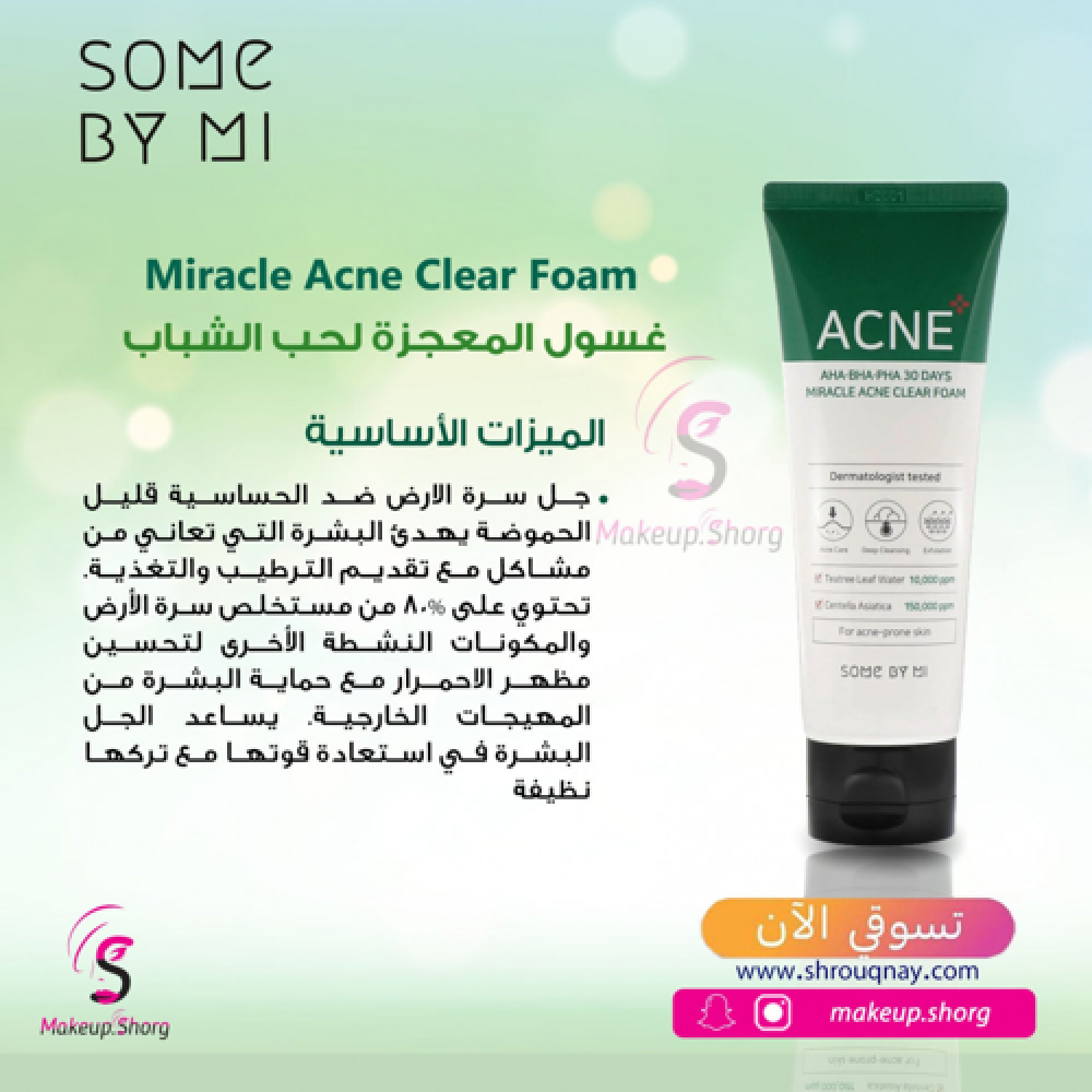 سوم باي مي تقدم منظف البشرة الرغوي اليومي لحب الشباب المعجزة ، يعمل على تقليل البثور و حب الشباب عن طريق إزالة الدهون الزائدة و الكيراتين و المتراكمة في المسامات ، كما يعمل على تنظيف البشرة بشكل قوي مع حمايتها من الجفاف و مساعدتها على حفظ توازنها الحمضي ، معزز بمواد طبيعية لطيفة على البشرة ، يناسب البشرة الدهنية و البشرة المعرضة للبثور ، متوفر بحجم 100 مل