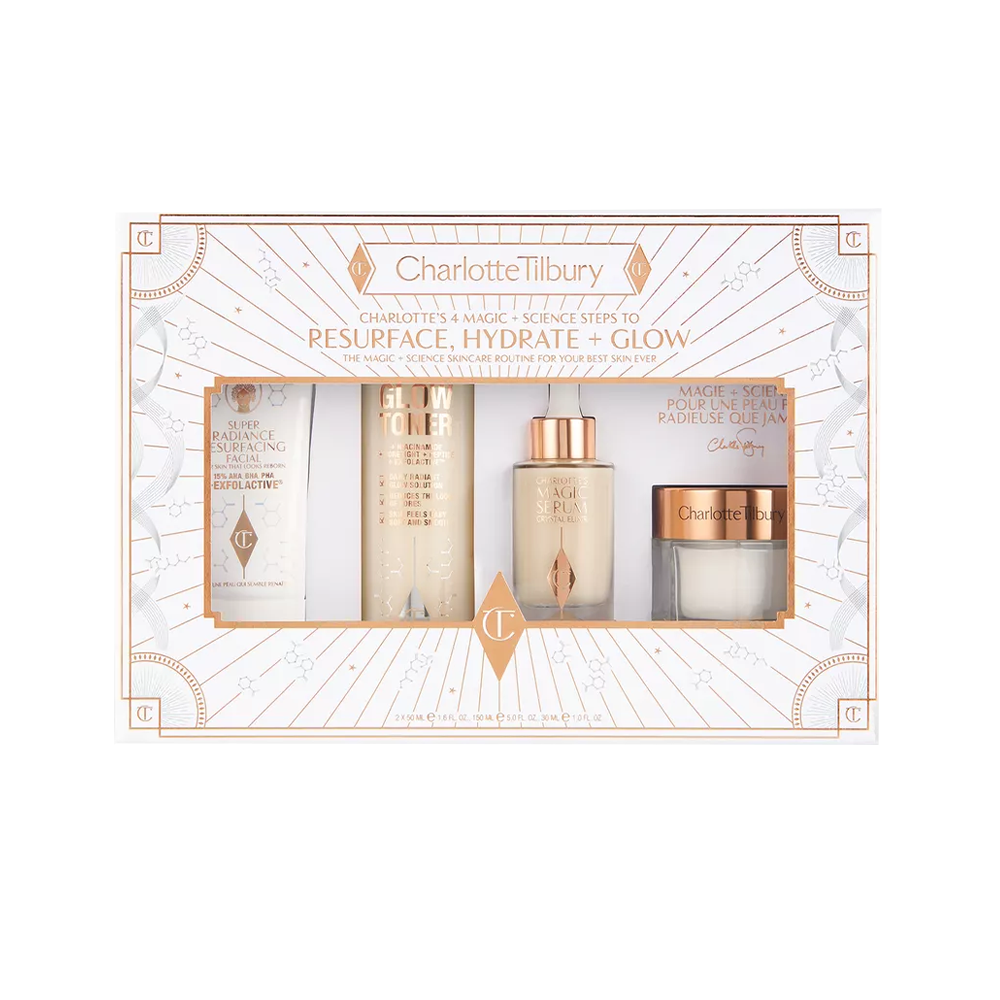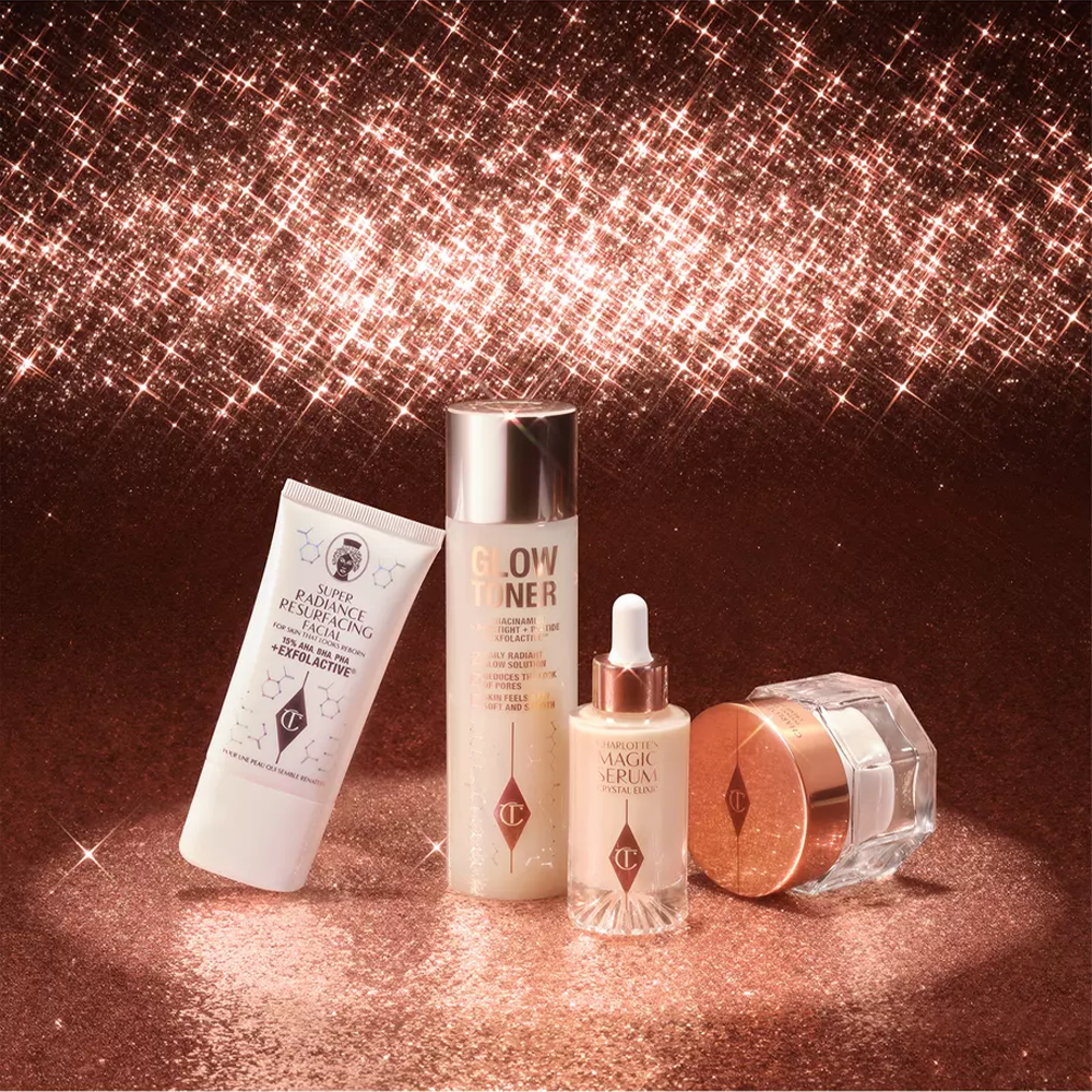 إذا كنت تحلمين بالحصول على بشرة ممتلئة ومفعمة بالحيوية والإشراق، فلا غنى لك عن مجموعة 4 ماجيك + ساينس ستيبس من شارلوت تلبوري لتنعيم البشرة وترطيبها وتعزيز إشراقتها بفاعلية. تحتوي المجموعة على كريم ماجيك الشهير بفاعليته في تجديد حيوية البشرة الجافة، حيث تم ابتكاره في البداية لتحضير بشرة عارضات الأزياء والآن هو بين يديك في المنزل. كما تشمل سيروم كريستال اليكسير لتحفيز إنتاج الكولاجين وترطيب البشرة بنسبة 172% خلال ساعة واحدة، إضافة إلى تونر جلو ومقشر سوبر راديانس لتوحيد ملمس البشرة وتجديد الخلايا لتنعمي بإطلالة مشرقة وموحدة. ستكون هذه المجموعة حلاً سحريًا للحصول على بشرة جذابة مثل النجمات وأنت في المنزل.
