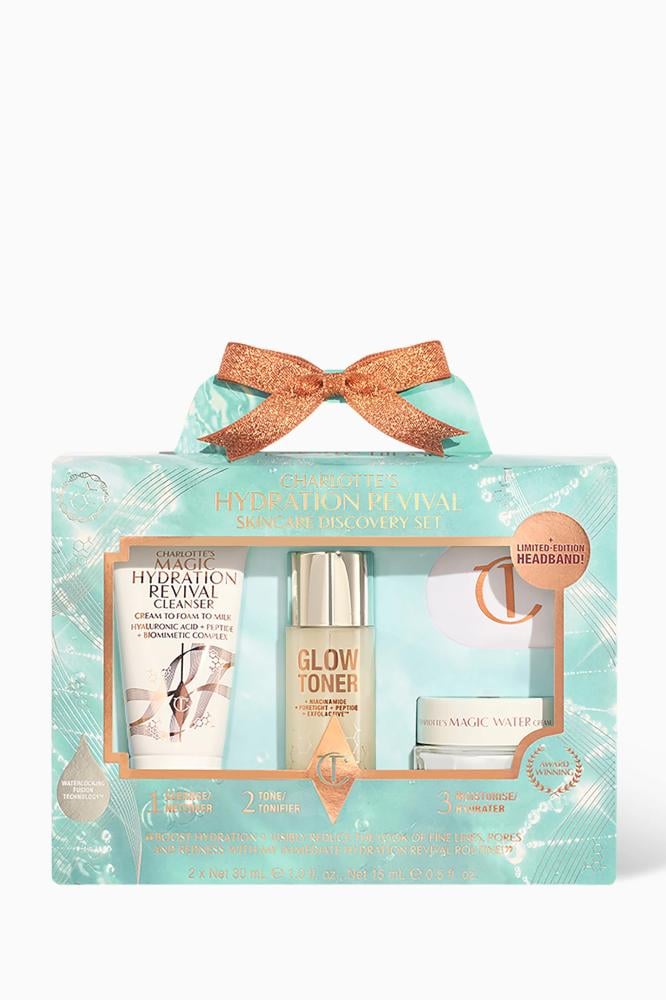 تمثل مجموعة شارلوت هيدريشن ريفايفل الاستكشافية للعناية بالبشرة من شارلوت تلبوري الروتين الأمثل المكون من 3 خطوات للحصول على بشرة مرطبة ومتوهجة ومنتعشة أثناء التنقل، فهي تحتوي على غسول ماجيك الحائز على جوائز لترطيب البشرة وإنعاشها، وتونر جلو وكريم ماجيك ووتر، بالإضافة إلى طوق رأس بتصميم مستوحى من المنتجعات الصحية. وتعمل هذه المجموعة على تنظيف البشرة وتوحيد لونها ومنحها ترطيبًا يدوم طويلاً. وثبتت فعالية هذه المنتجات سريريًا في تنعيم البشرة وتنقية المسام والاحتفاظ بالترطيب، وتعد هدية مثالية في موسم الأعياد للحصول على بشرة متوهجة.