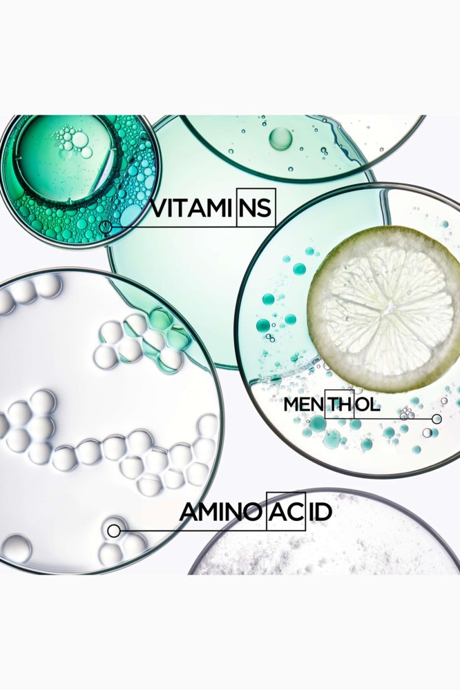 ماء، دينات الكحول، ليسات خميرة نبات ثنائي الشقوق، اسكوربيل جلوكوسيد، أمينوميثيل بروبانول، زيت الخروع المهدرج بولي ايثيلين غليكول-40، كربومير، مانوز، بولي سوربات 21، ألفا غلوكان سكريات قليلة التعدد، فينوكسي إيثانول، جليسرين، بنتيلين غليكول، عصارة جذور إجاص الأرض، خلاصة الخميرة، بنزوات الصوديوم، مالتوديكسترين، ليمونين، غيرانيول، هكسيل سينامال، بنزوات البنزيل، كحول البنزيل، لاكتوباسيلوس، لينالول، سيترال، عطر