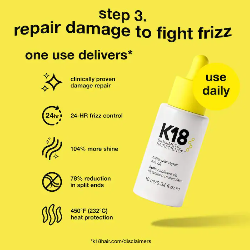 - زيت إصلاح الشعر الجزيئي: التحكم في التجعد على الفور وعلى المدى الطويل، وحماية من الحرارة حتى 450 درجة فهرنهايت