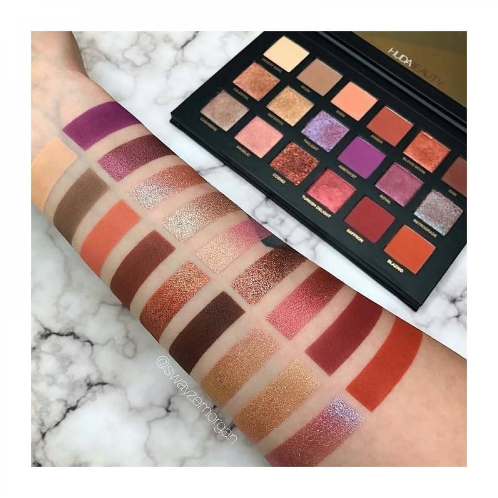 هدى ببيوتي باليت ظلال العيون المكون من 18 لون مستوحاة من ألوان الصحراء و ألوان غروب الشمس، تتميز بألوانها الحارة بدرجات البرتقالي و الأحمر و النحاسي و الوردي ، تحتوي على ظلال لامعة و ظلال مطفية ، عدد الظلال اللامعة 10 ظلال و المطفية 8 ظلال ، مناسبة لجميع الأوقات و خاصة الأوقات المسائية ، تتميز العلبة بخفتها و بتصميمها الرفيع الذي يجعل حملها ليس صعبا ، تتمتع بصبغة عالية و بقوام ناعم على الجلد و بثبات عالي