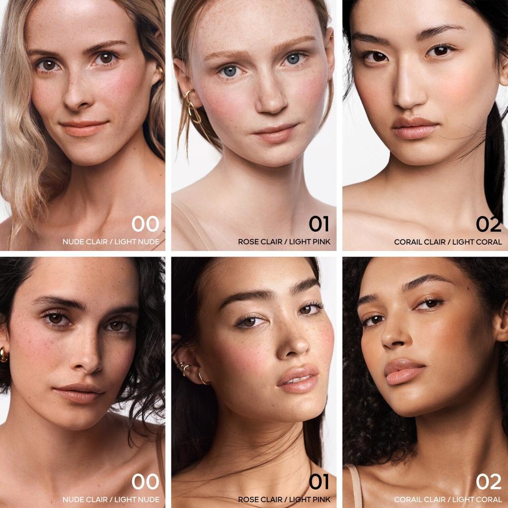 6 ألوان تناسب لون بشرتكِ وتفضيلاتك الشخصية: 3 درجات، نود وزهري وكورال، كل منها متوفر بدرجتين من الكثافة: فاتحة وداكنة.
