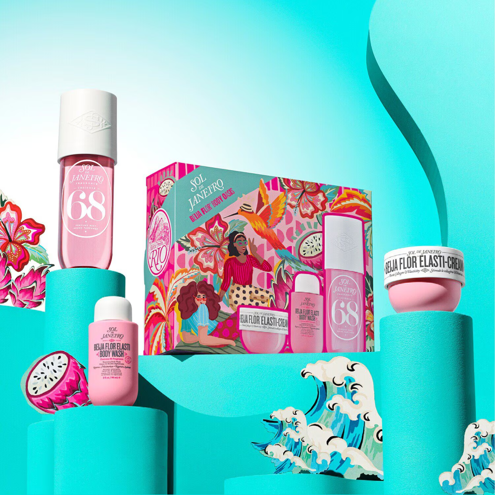 تضم هذه المجموعة الثلاثية عبوات صغيرة الحجم من كريم بيجا فلور™ إيلاستي وغسول بيجا فلور™ لتجديد بشرة الجسم، بالإضافة إلى رذاذ عطر شيروسا 68 بحجم كامل.