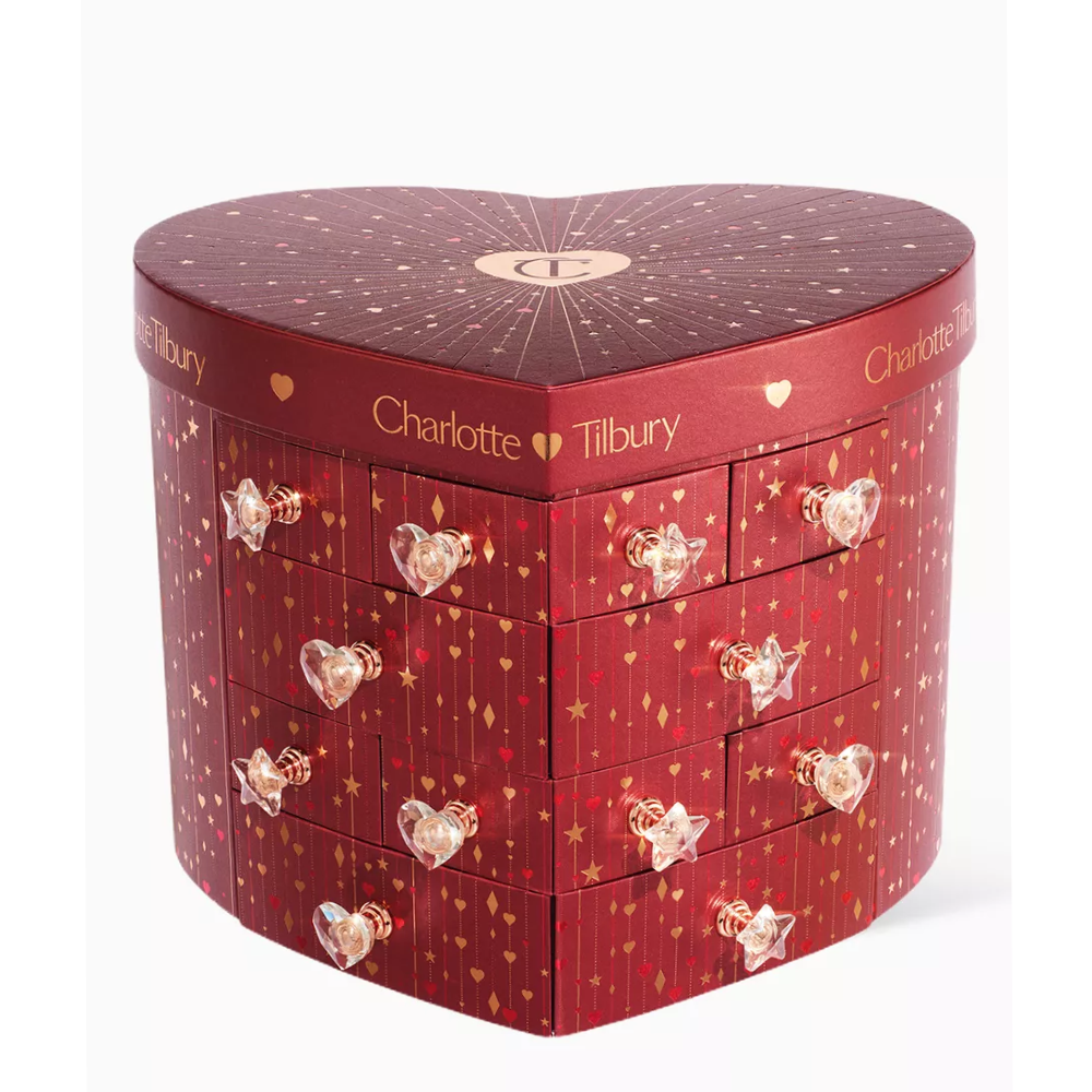 تقدم ماركة شارلوت تلبوري مجموعة تقويم الجمال شارلوت تشيست اوف لوف الفاخرة التي تحتوي على اثني عشر درجًا مليئًا بمستحضرات المكياج والعناية بالبشرة منها بأحجام كاملة، مثل هايلايتر بيوتي لايت وزيت الشفاه ماجيك كريستال اليكسير، ومنها بأحجام مناسبة للسفر، مثل كريم ماجيك وأحمر الشفاه بيلو توك وبخاخ تثبيت المكياج ايربراش فلوليس. وتأتي المجموعة في صندوق لمستحضرات التجميل يجعلها هدية مثالية تعتزين بها للأبد أنت أو أحد أحبائك.