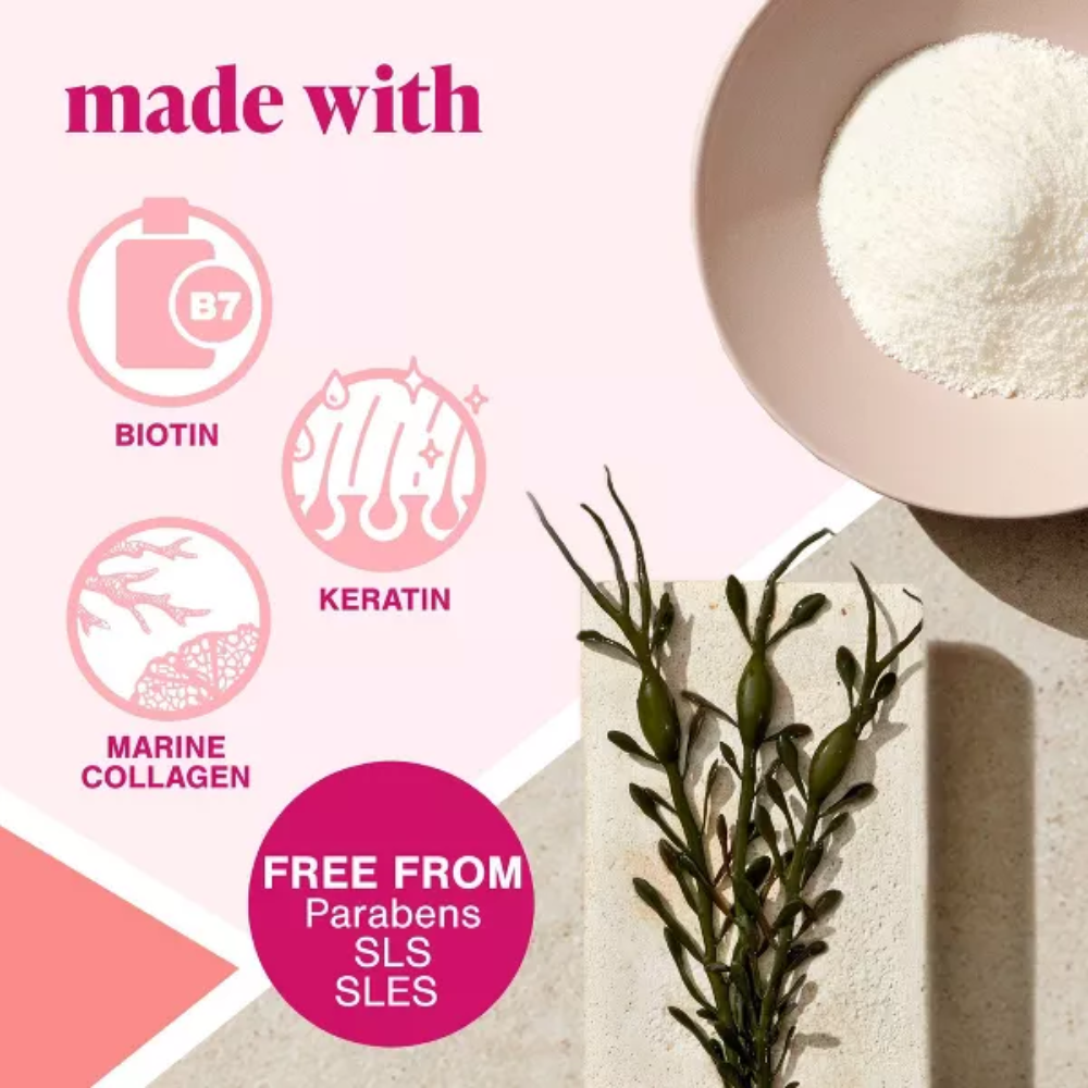 يحتوي على مركب خاص يحتوي على مكونات تم اختبارها سريريًا ومستمدة من مصادر طبيعية، مثل البيوتين والكيراتين ومستخلص الأعشاب البحرية