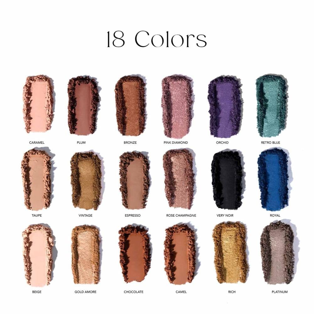 • ‏7 ألوان حريرية غير لامعة و11 لونًا لامعًا بقوام بودرة كريمي: أوركيد، رويال، ريترو بلو، برونز، فينتج، ريتش، روز شامبين، جولد امور، بلاتينوم، بينك دايموند، كاراميل، كاميل، بيج، بلوم، تشوكليت، إسبريسو، توب، فيري نوار
